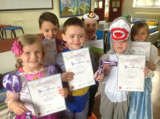 Lots of children took part in the 'Reading Miles' challenge from the local education authority. These children read all the way around the world and made it back home - over 11 hours of extra reading. They were rewarded with a certificate and a bar of chocolate.